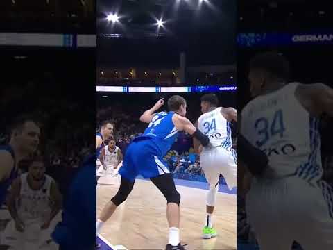Head Coach Gianmarco Pozzecco of Italy jumps on Giannis Antetokounmpo in celebration of knocking out Serbia in EuroBasket.