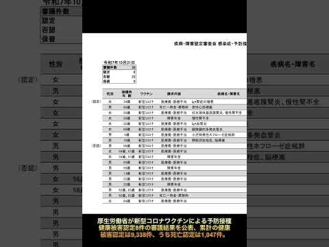 厚生労働省が2025年10月31日「感染症・予防接種審査分科会」で新型コロナワクチンによる予防接種健康被害認定8件の審議結果を公表、累計の健康被害認定は9,338件、うち死亡認定は1,047件。
